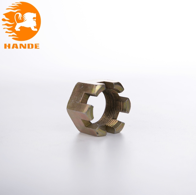 開槽螺母的作用:就是通過緊固穿過前后輪輪軸螺桿固定車輛前后輪軸,使車架和輪胎固定在一起,為了防止螺母松脫,必須用開口銷通過開槽螺母的槽進(jìn)行固定,而開口銷要固定住開槽螺母就必須從輪軸螺桿中間穿過,通常輪軸螺桿兩頭都需要鉆孔,孔的直徑大小和開槽螺母的槽寬和槽深決定了選用什么規(guī)格的開口銷,當(dāng)選用 的輪軸螺桿和開口銷和開槽螺母都比較匹配的時(shí)候,螺母就通過輪軸螺桿固定住前 輪和車架,開口銷通過輪軸螺桿的孔緊固件住了開槽螺母,使開槽螺母不產(chǎn)生松脫, 使車輛在運(yùn)動(dòng)的時(shí)候也不松脫.